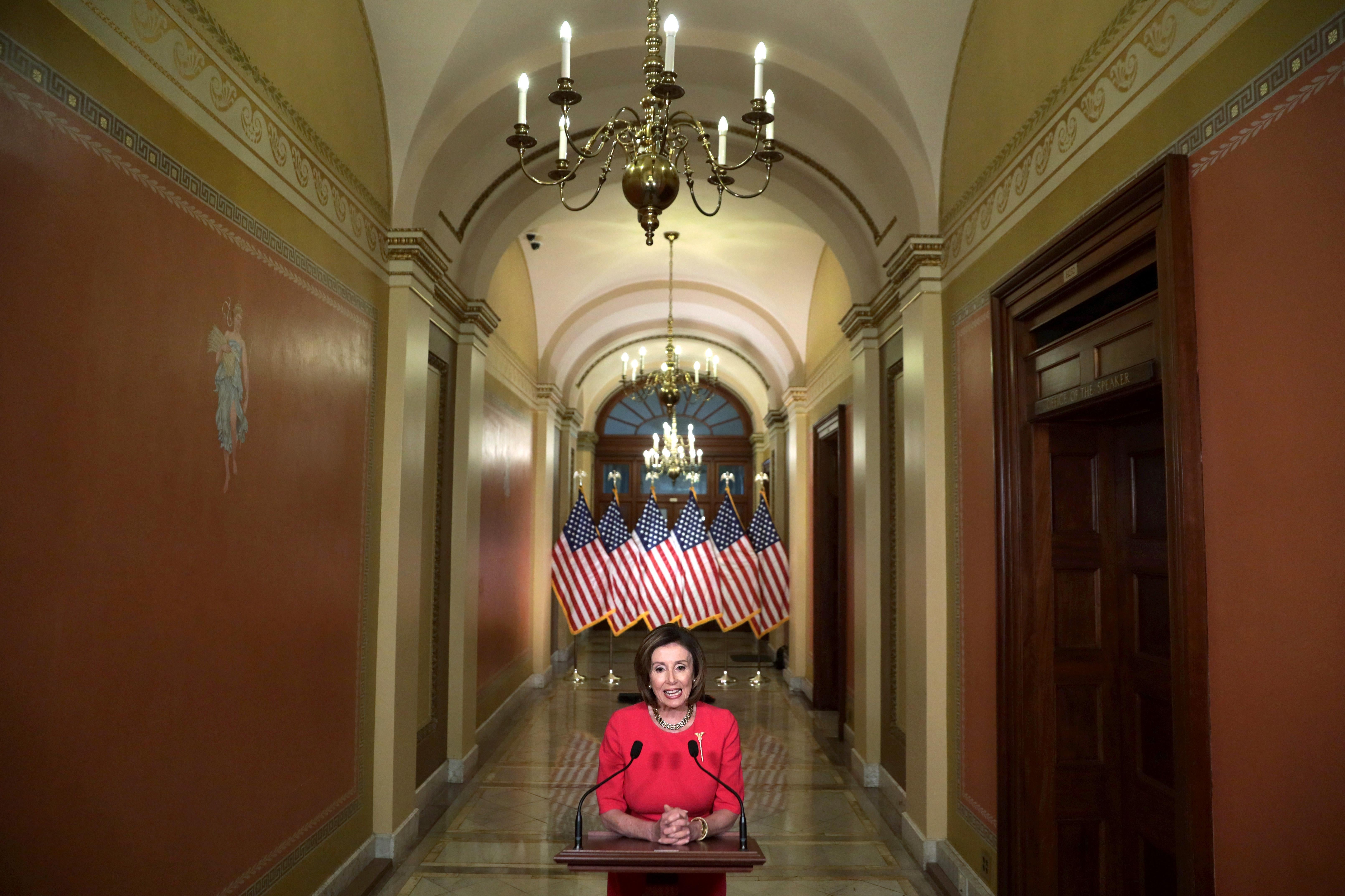 Speaker of the House Nancy Pelosi delivers a statement at the hallway of the Speaker’s Balcony at the U.S. Capitol on Monday.