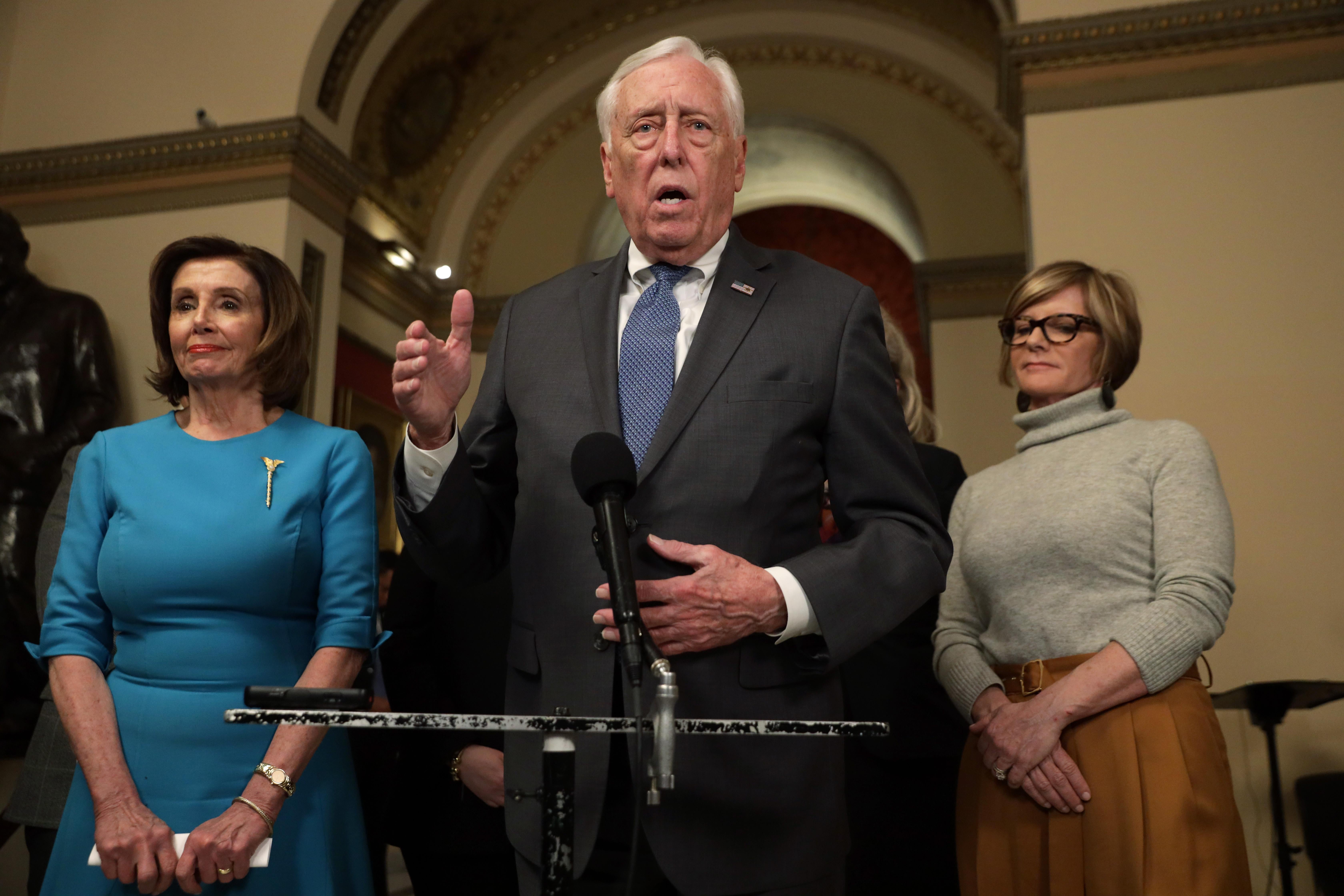 House Majority Leader Steny Hoyer speaks to members of the media as Speaker Nancy Pelosi and Rep. Susie Lee listen at the U.S. Capitol on March 13.